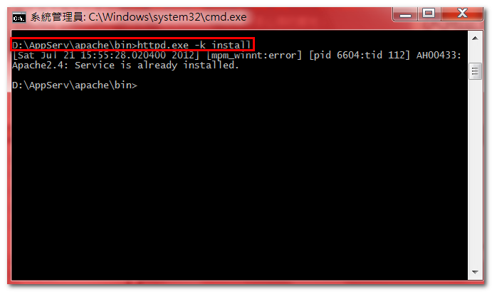 於 DOS 視窗底下,找到 /bin/ 底下 httpd.exe 的位置後,先空一格,再輸入「-k install」後,按「Enter」,即可啟動 Apache。